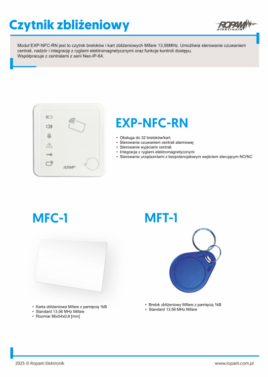 Moduł EXP-NFC-RN jest to czytnik breloków i kart zbliżeniowych Mifare 13,56MHz. Umożliwia sterowanie czuwaniem centrali, nadzór i integrację z ryglami elektromagnetycznymi oraz funkcje kontroli dostępu. Urządzenie pozwala na sterowanie za pomocą tagów NFC, przycisku zbliżeniowego na urządzeniu oraz aplikacji RopamNeo poprzez połączenie bluetooth.