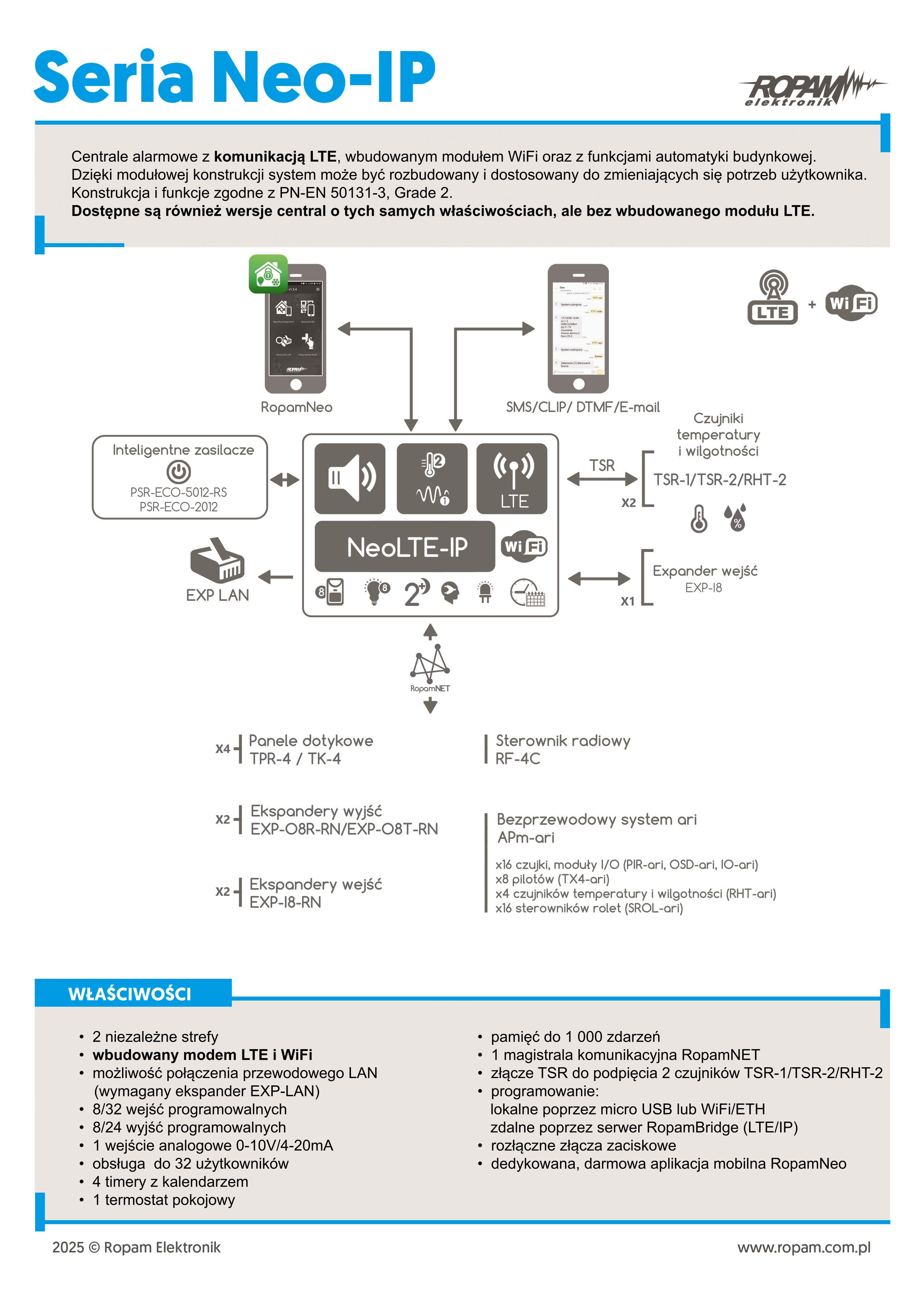 NeoLTE-IP wraz z urządzeniami peryferyjnymi to rozwiązanie integrujące elektroniczny system sygnalizacji włamania i napadu oraz automatykę domową. Dzięki modułowej konstrukcji system może być rozbudowany i dostosowany do zmieniających się potrzeb użytkownika.